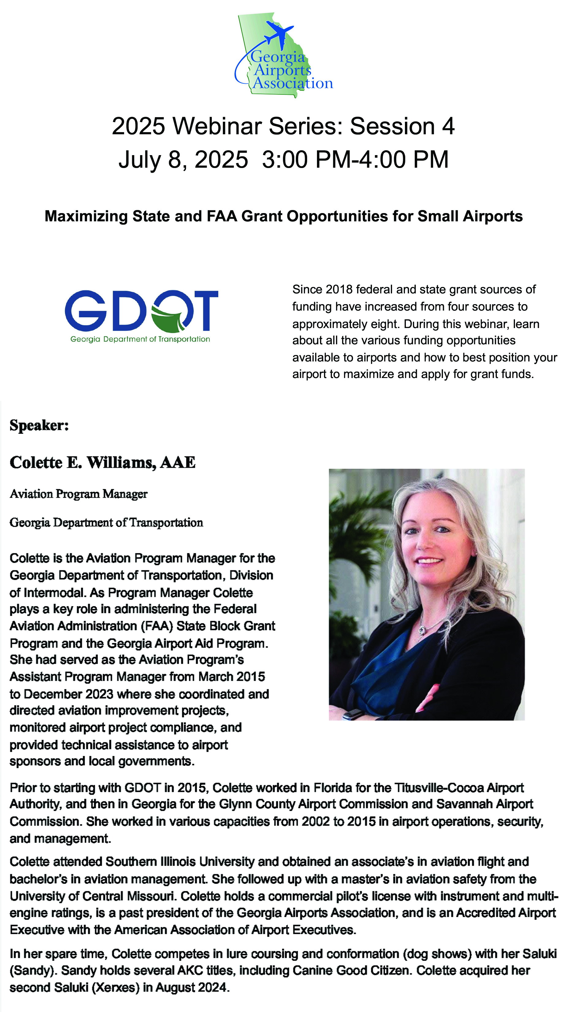 GAA’s lobbyist will be covering recent activity and preparation for the upcoming legislative session, along with being available to answer questions from the members. Edward will also work with GAA airport members to bring local legislators to your airports.